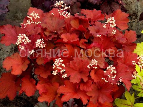 - С мая по август гейхера Рио радует продолжительным цветением — почти всё лето на ярко‑красных цветоносах появляются аккуратные колоски‑мётелки с небольшими белыми цветками. Такое сочетание контрастных оттенков и изящных форм создаёт неповторимый декоративный эффект.