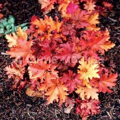 - Листва резная, плотная, может быть как оранжевой, так и золотистой, янтарной с пурпурно-розовым низом. Окраска листьев может меняться в течение сезона. Край листа немного гофрированный.