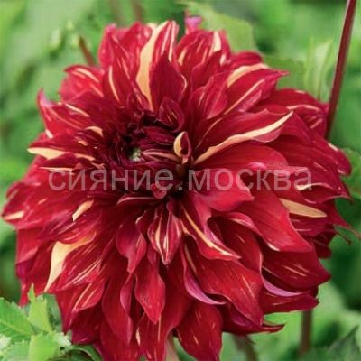 - Крупный махровый цветок имеет форму шара. Его диаметр может достигать 25 см. Широкие, плоские лепесточки заострены и слегка закручены. Они напоминают язычки. Двухцветный георгин привлекает к себе внимание жёлтыми полосами на бордовом фоне.