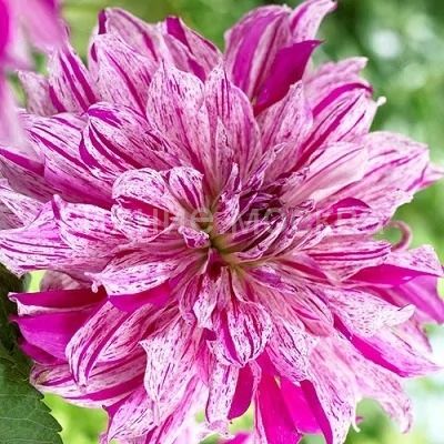 - Одним из основных преимуществ георгинов является то, что они подходят для срезки. Их крупноцветковые соцветия диаметром в 25-26 см состоят из белых лепестков с ярко-лиловыми штрихами, пятнышками и вкраплениями. Это создает эффект двухцветного окрашивания, делая цветочную композицию ещё более интересной.