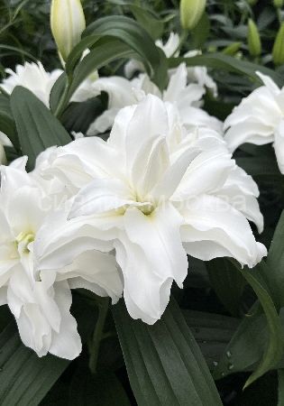 Изысканный сорт из восточных лилий. Густомахровые, белоснежные цветки, душистые, очень крупные, диаметром 21 см. Высота 110 см.