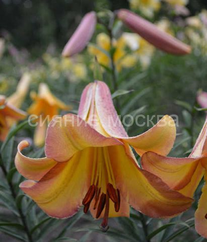 Райзинг Мун - высота растения 120 см. Цветок КРУПНЫЙ, желтый с палево-розовой каймой и темными пыльниками, диаметр цветка 22 см.