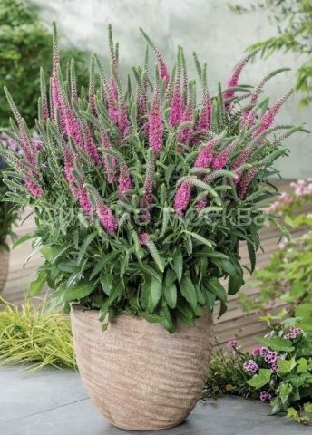 - Цветение вероники Анниверсари Нью Роуз происходит летом — в июне, июле и августе.