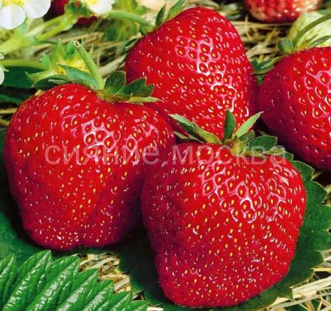- Ягоды: округлой формы, крупные, массой 20–35 г. Цвет спелой клубники — малиново-красный. Мякоть — светло-красная, сочная, средней плотности. Вкус — сладкий с земляничным ароматом.